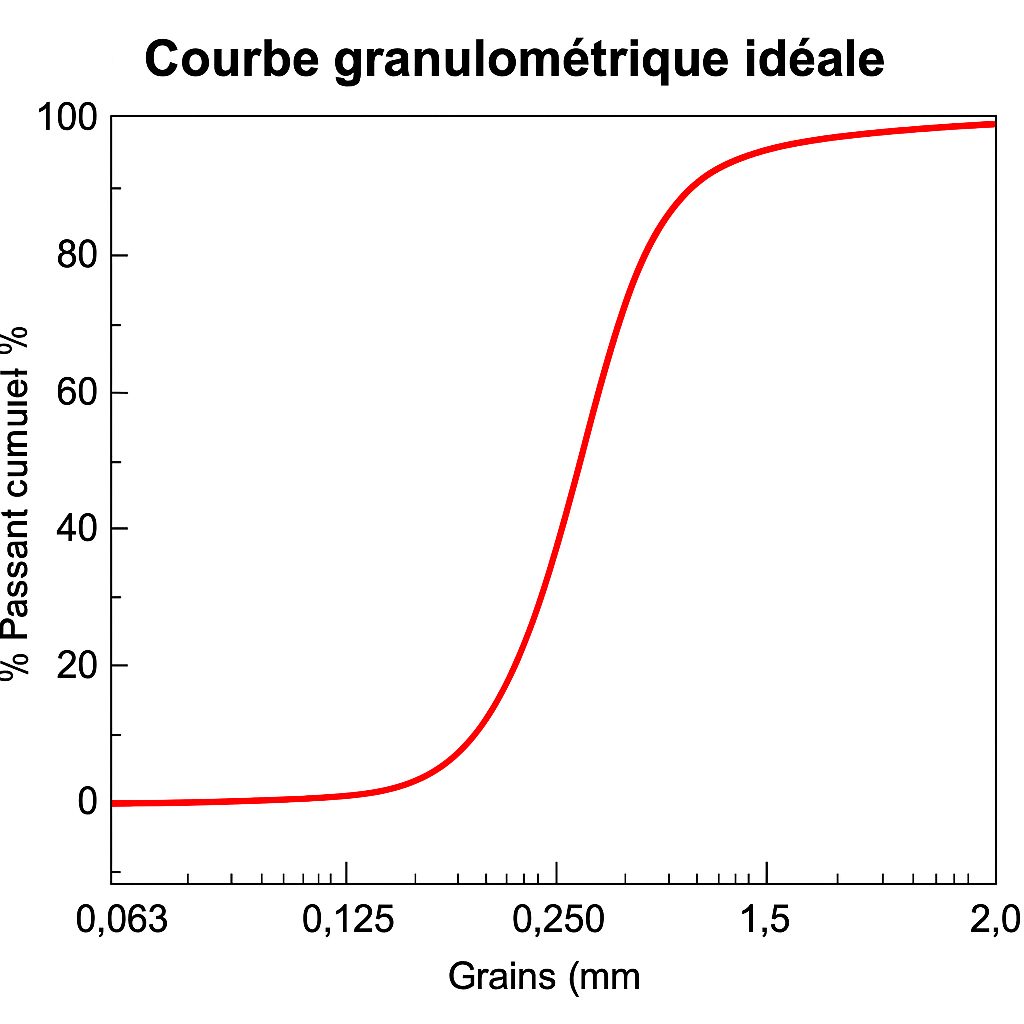 Une courbe typique de sable équestre « idéal » montre une majorité de grains dont la taille est comprise entre 0,125 mm et 0,5 mm. La forme de la courbe renseigne sur la répartition des tailles. Cette répartition est primordiale, car elle conditionne le compromis entre capacité à se compacter / rester souple et capacité à drainer / retenir l’eau.